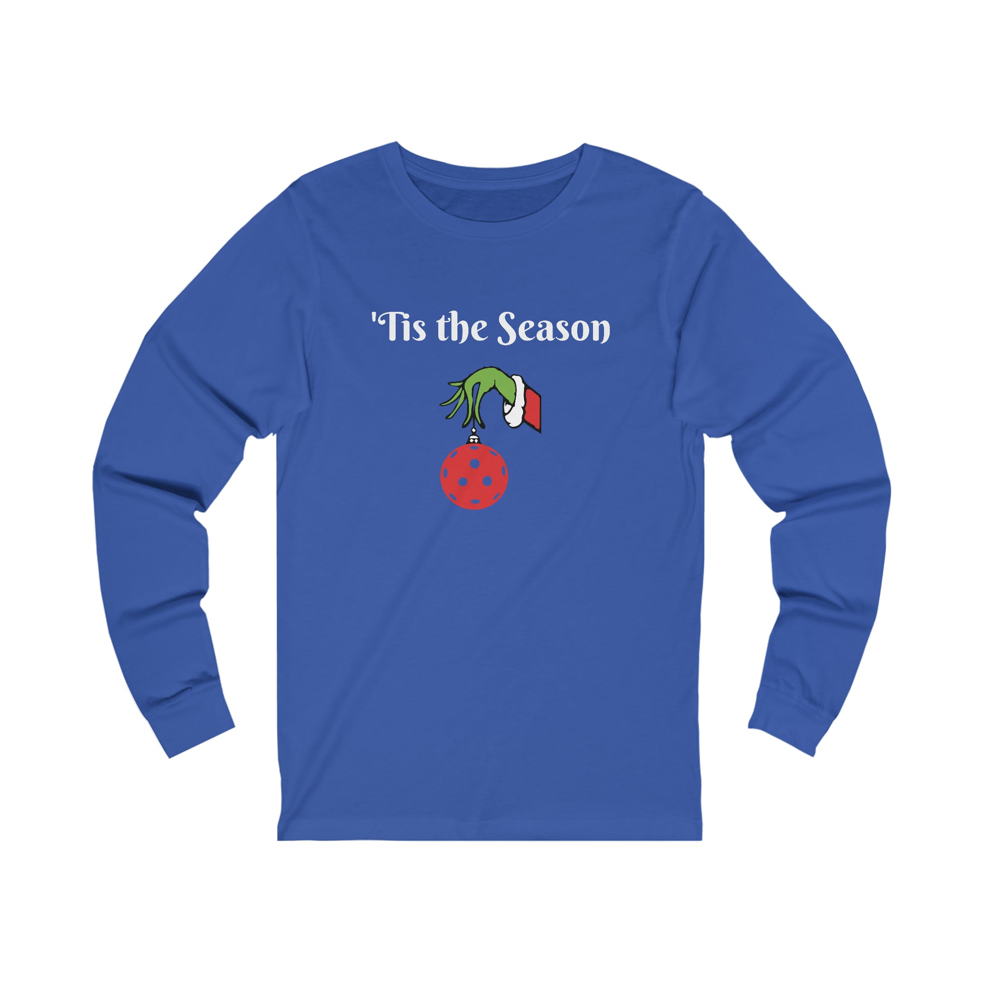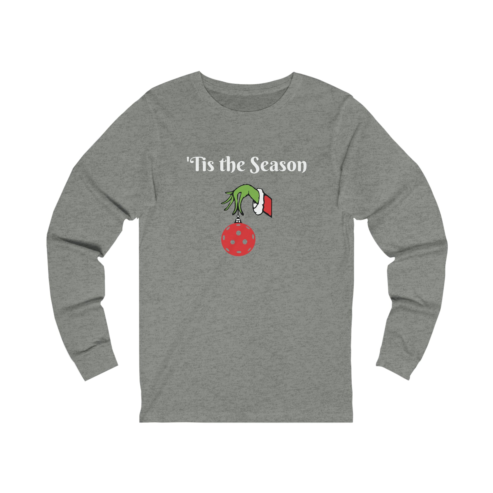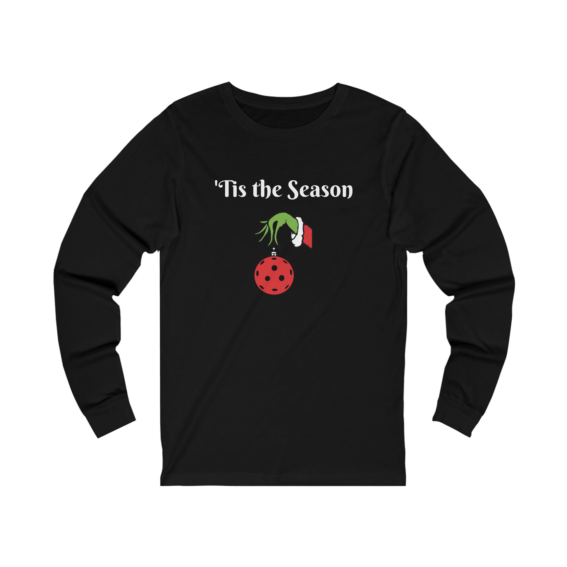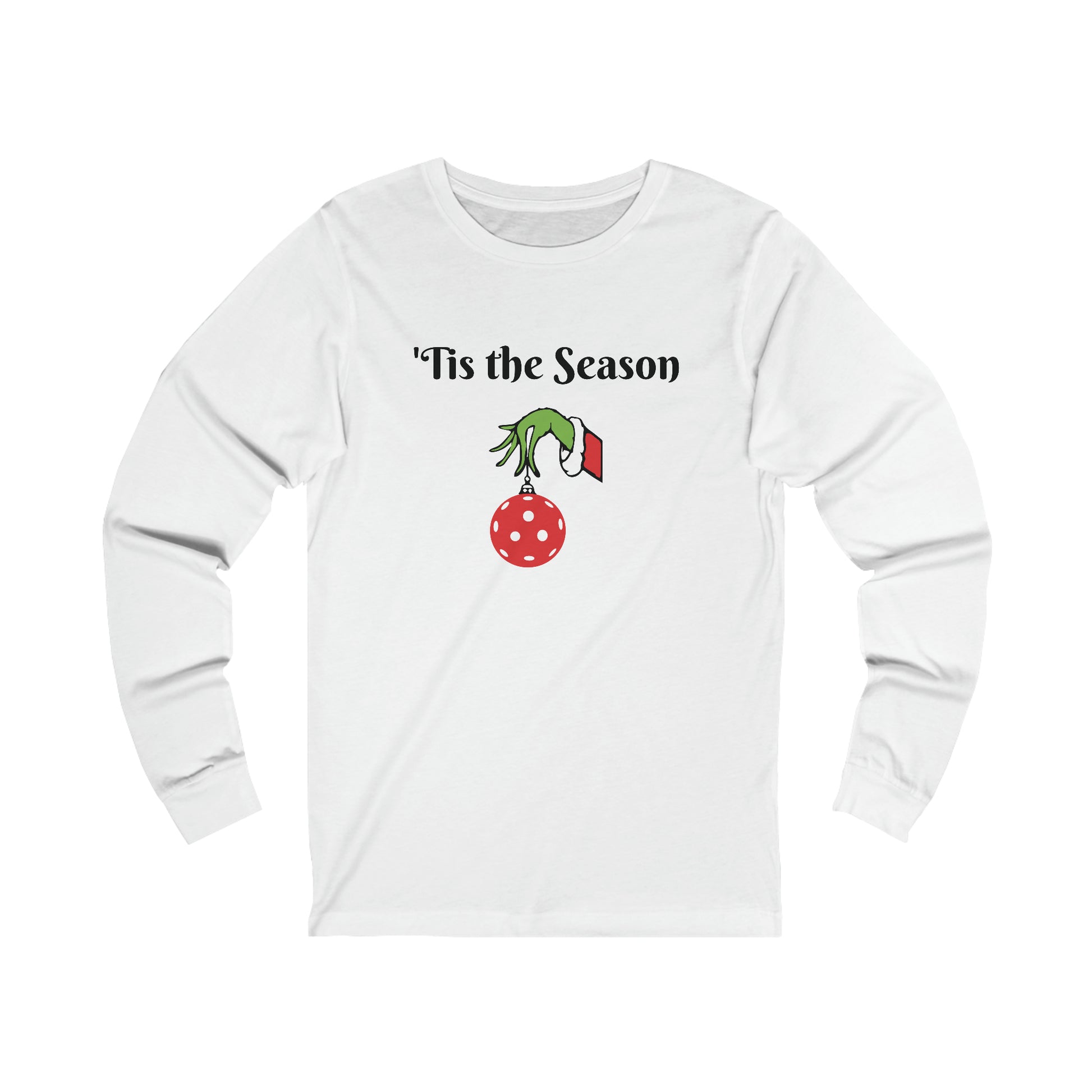 This festive long sleeve t-shirt features that iconic green hand dangling a red pickleball ornament, just tempting you to play! Featuring the words 'Tis the Season, it will bring a touch of holiday magic to your pickleball game.