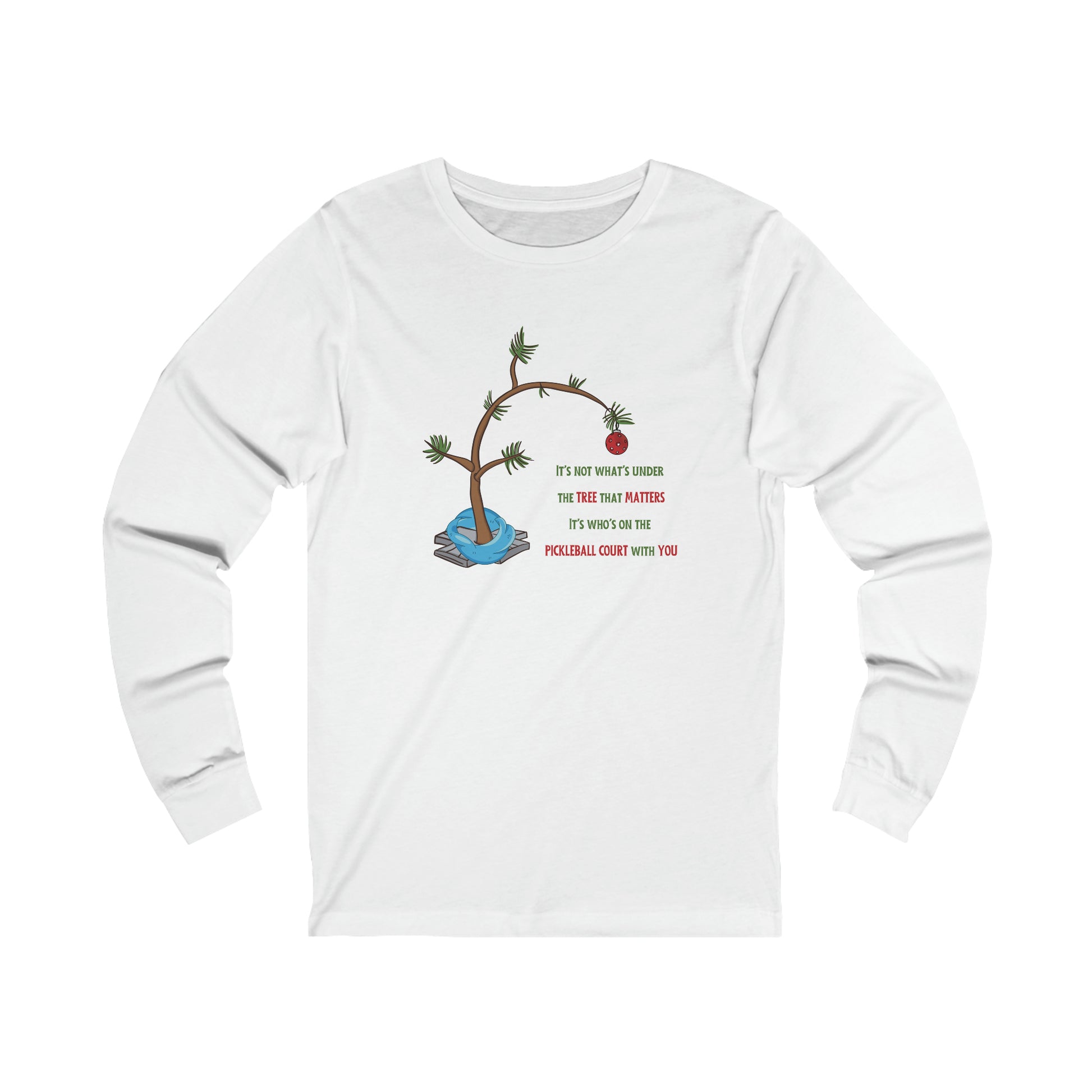 Embrace the essence of togetherness this holiday season with our pickleball-themed Christmas tree long sleeve t-shirt. Featuring a humble tree inspired by the timeless classic with a red pickleball ornament and the message, "It's not what's under the TREE that MATTERS, It's who's on the PICKLEBALL COURT with YOU," this soft and comfortable tee beautifully captures the spirit of the holidays. Share the sentiment of connection and joy with this heartfelt design that goes beyond the shirt, emphasizing the significance of the people with whom you share this wonderful game.