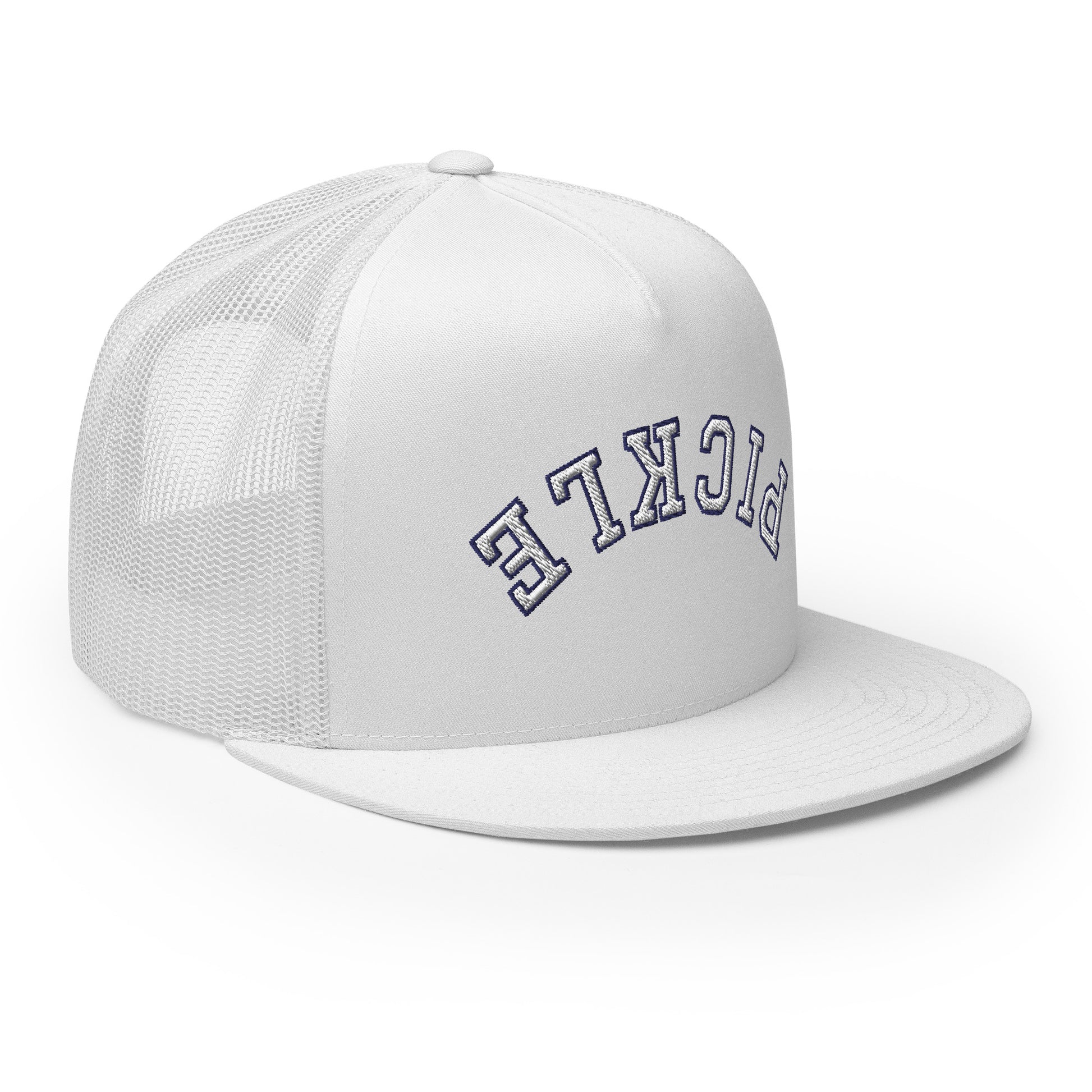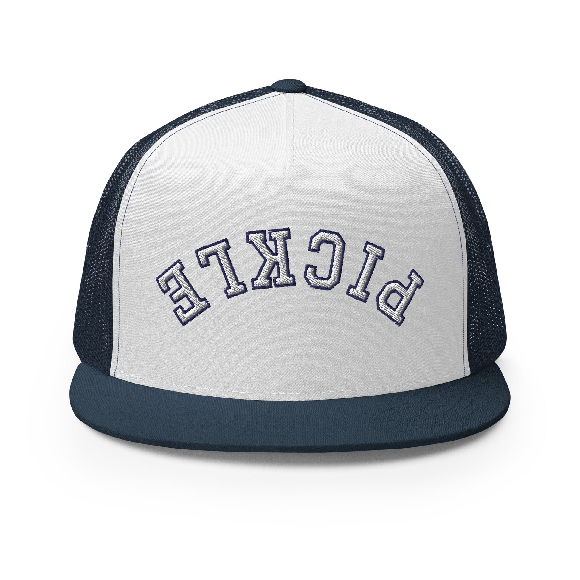 Upside Down Pickle Embroidered Trucker Hat - White Letters/Navy Outline