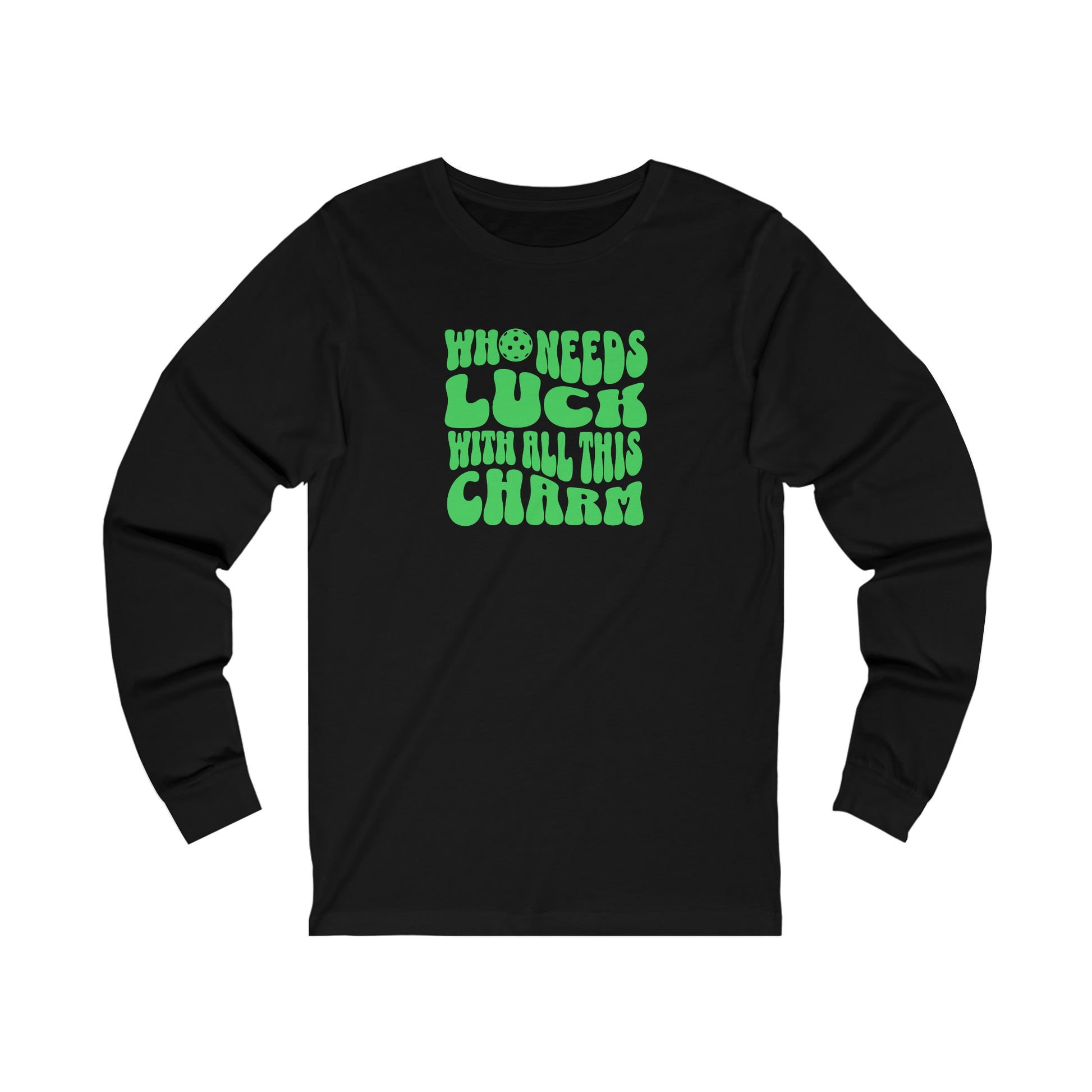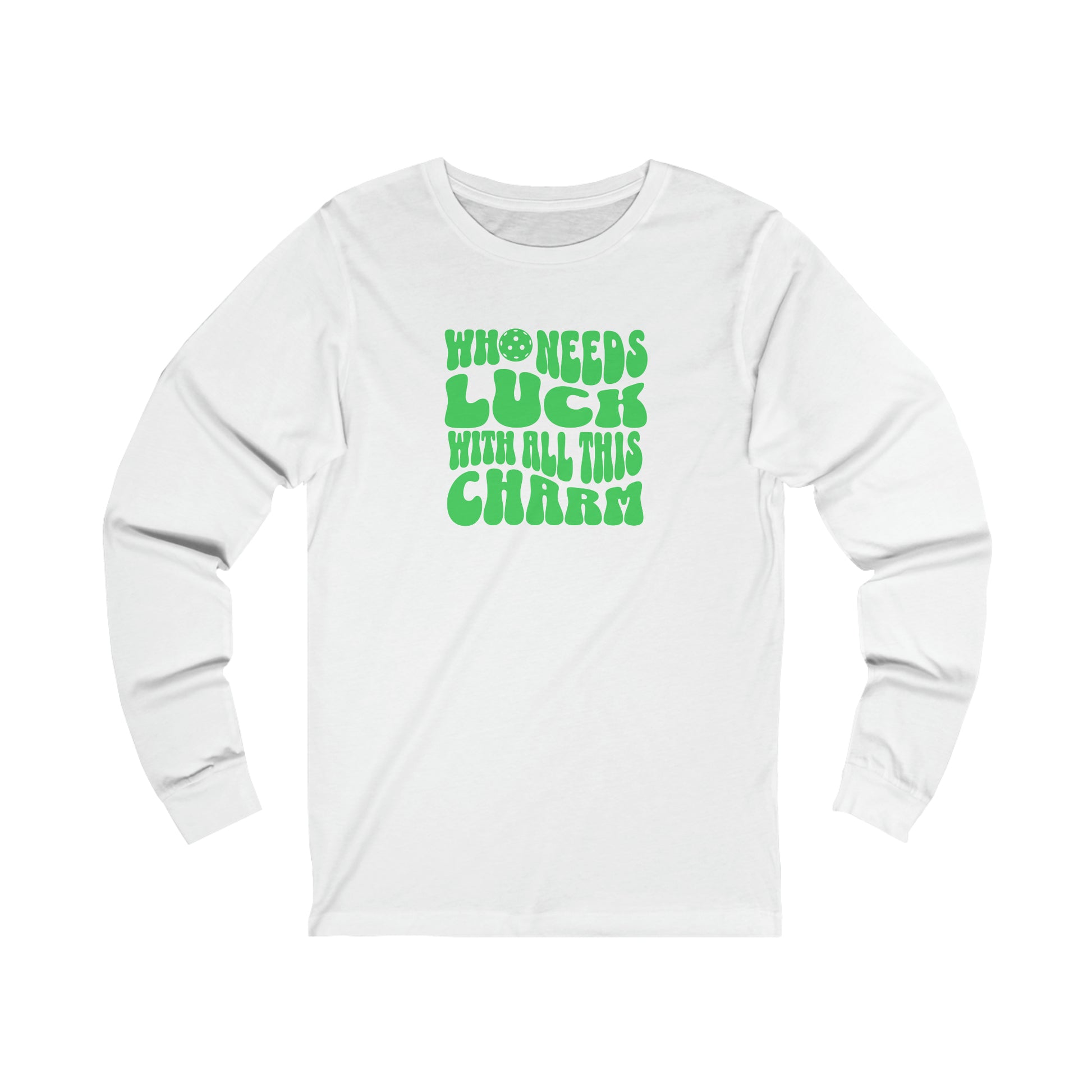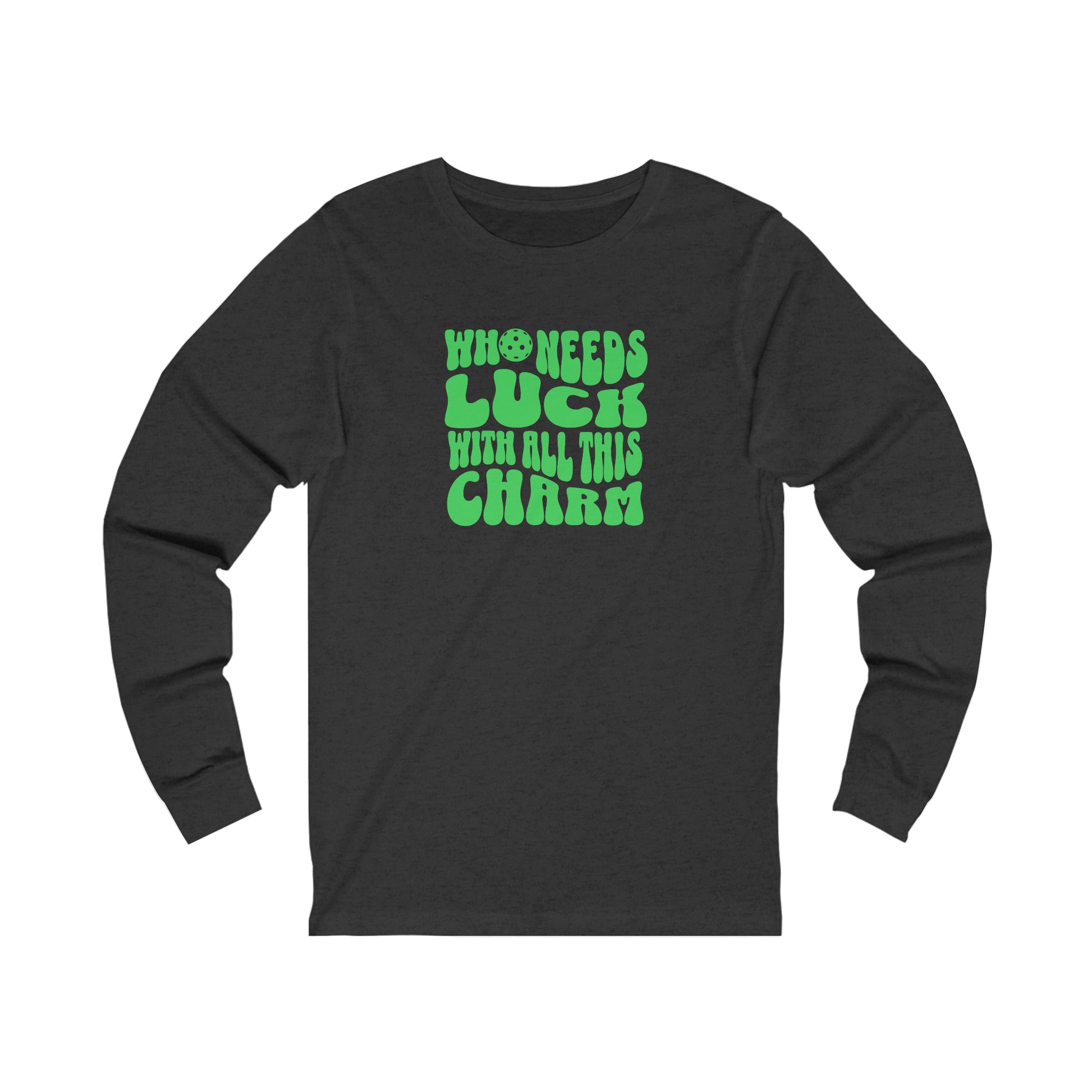 Bring a smile to the face of everyone around you when you sport the Who Needs Luck With All this Charm long sleeve tee. Perfect for wearing year round, on and off the court!